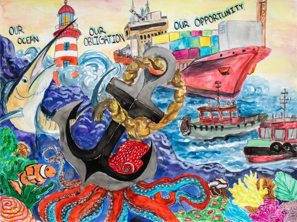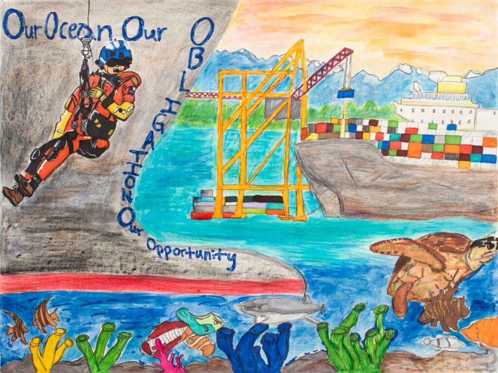 Every year, the United States Coast Guard (USCG) partners with the North American Marine Environment Protection Association (NAMEPA), and the Inter-American Committee on Ports of the Organization of American States (CIP-OAS) to celebrate talented artists throughout the Americas in the K-12 Student Art Contest. Students that enter the contest create a poster that represents an environmental theme as identified by the International Maritime Organization’s (IMO) World Maritime Day.